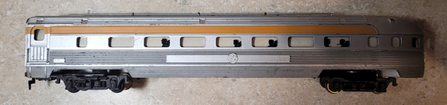 Lonny and Paul Beno came across this car at a recent show. These photos show two sides of what appears to be a Northern Pacific car painted to represent the observation car of the Sunset Limited set, a car that was never made. The fact that the painter only lettered one side of the car, which was typical practice with paint samples, and the fact that they didn't even bother to remove Northern Pacific "yin/yang" symbol, but simply spray painted over it, argues for the fact that this is a genuine paint sample and not a reproduction. It is interesting to note that the numbering sequence in Maury Romer's 5 digit HO production lists assigns the numbers following the unlighted Sunset Limited coach to other freight cars, however the number 33712 is assigned to a lighted version of a Sunset Limited observation car. 33710 and 33711 are assigned to a lighted combine car and a lighted dome car respectively, so it appears Gilbert was planning a lighted version of the Sunset Limited set, possibly containing only a combine, dome, and observation car. The release of these lighted models was set for 1963, the year Gilbert ceased production of HO. At that same show, Lonny and Paul came across 2 other cars which appear to be reproduction cars of a dome car and an observation car to complete the Sunset Limited set. For more on these reproduction cars, click here. |